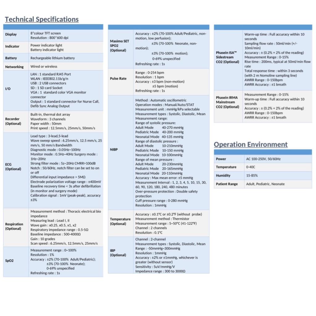 - Measured parameter – TEMP, ECG, heart rate, RESP, NIBP, etCO2, SpO2
